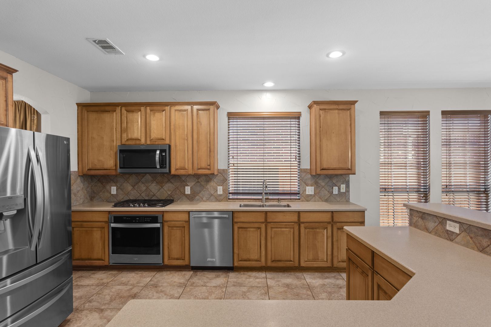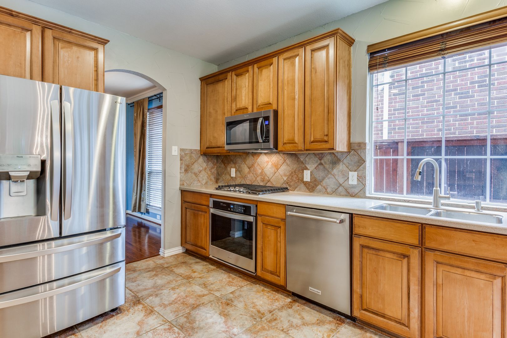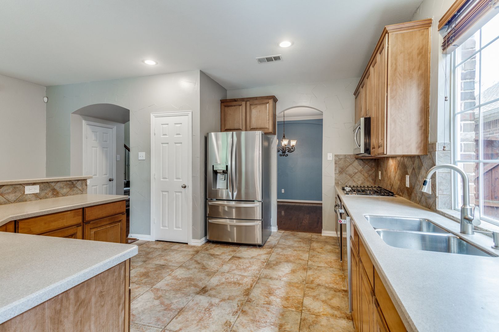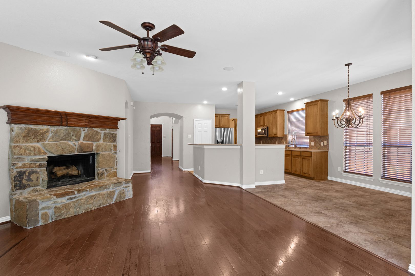 Gorgeous Highland Homes situated in Lantana! Two-story ceiling entry & iron baluster rails wrap around the 2nd floor atop the spacious family area that features a stone fireplace. Hardwood floors & recently replaced carpet flow throughout the main areas. Recently painted (no blue paint) throughout the home & garage. Spacious kitchen comes complete with SS appliances, gas burner cooktop, ample counter & storage space, and an abundance of natural light giving the space an open airy feel. Grand primary suite on main level with the staircase leading up to the additional living space, perfect for a game room, along with the split bedrooms & 2 full baths. This beauty backs up to the greenbelt with community amenities galore! Community Pools, walking trails, fitness centers, club houses, tennis, basketball, etc. Owners are licensed, Pets are case by case, active renters insurance and enrollment in management company RBP.